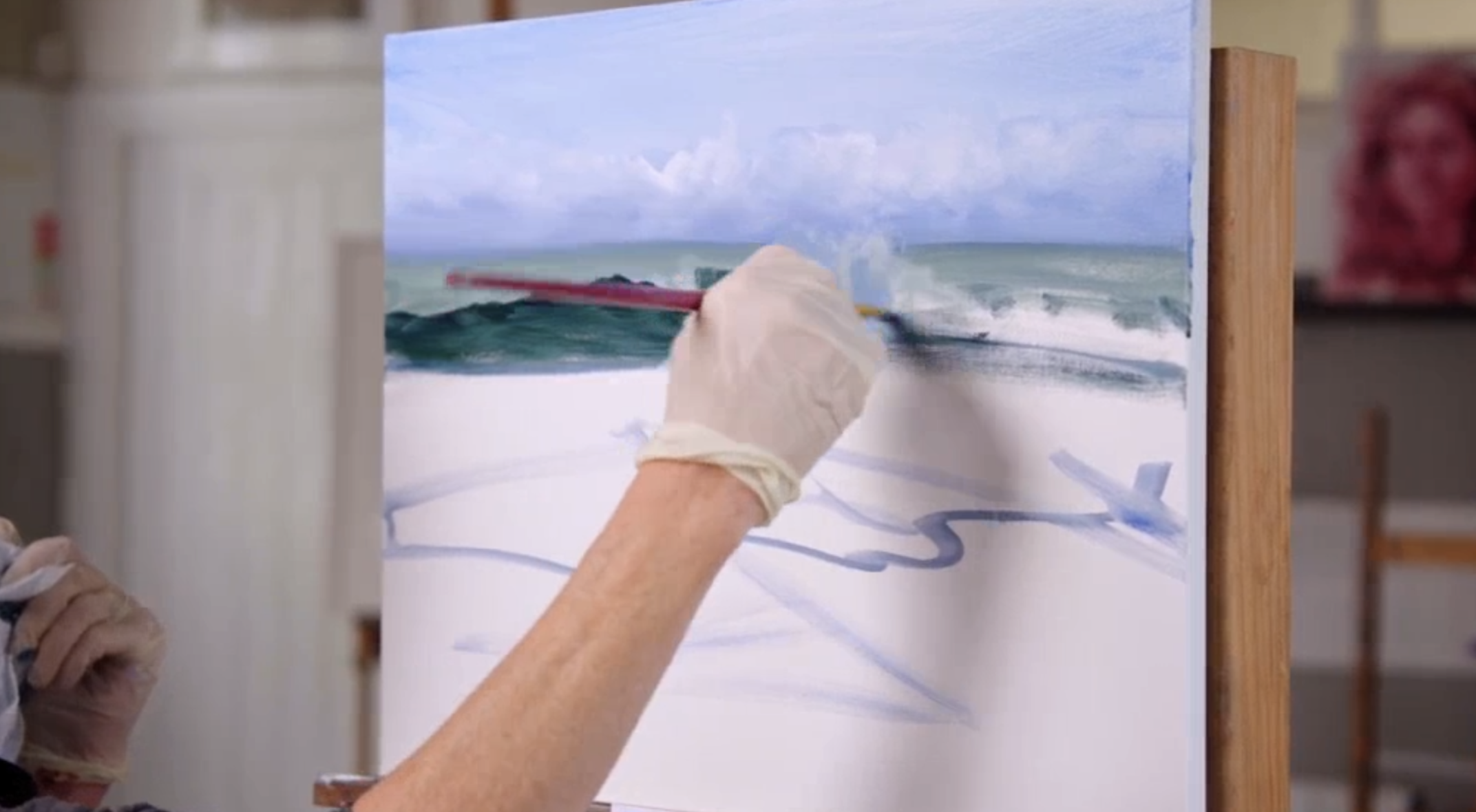 Works in Layers: She patiently builds the painting passage by passage, teaching you her method for establishing the sky, the background sea, the wave, the foam, and the sand without the colours turning muddy.